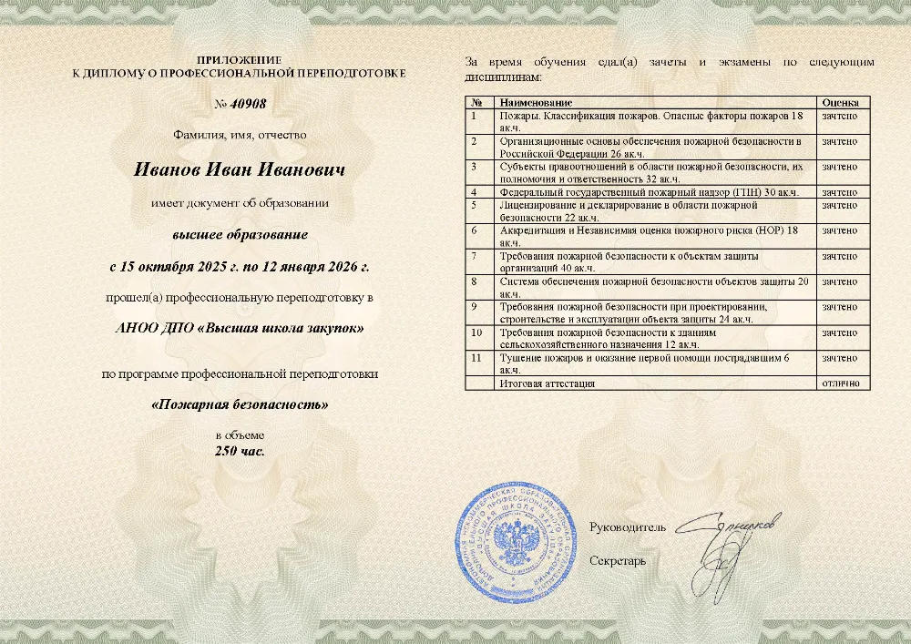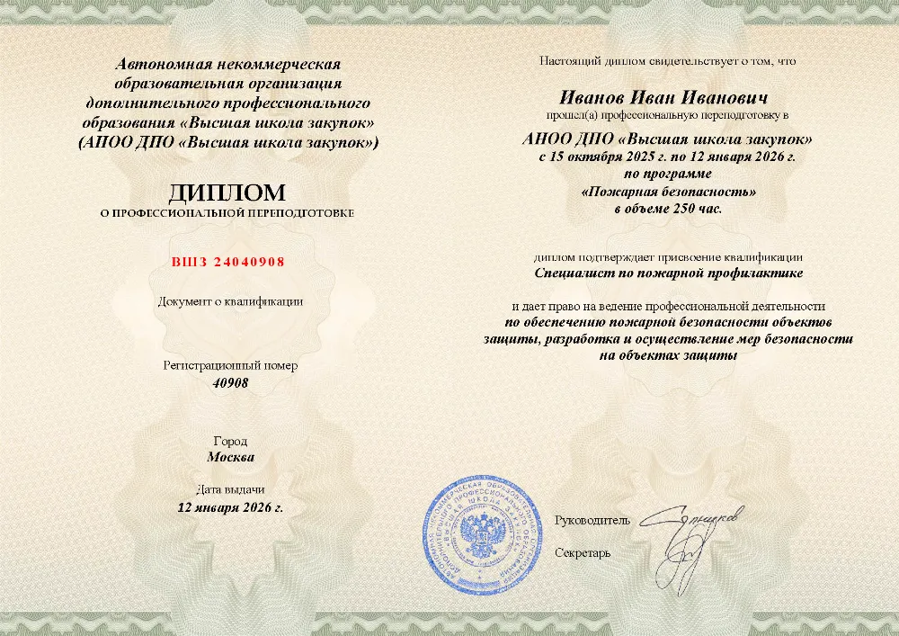Профессиональная переподготовка, 250 академических часов, 11 модулей: организационные основы и законодательство в области пожарной безопасности, лицензирование и надзор, требования к объектам защиты, проектирование, тушение пожаров и оказание первой помощи пострадавшим. Онлайн-обучение в в Воронеже с итоговой аттестацией.