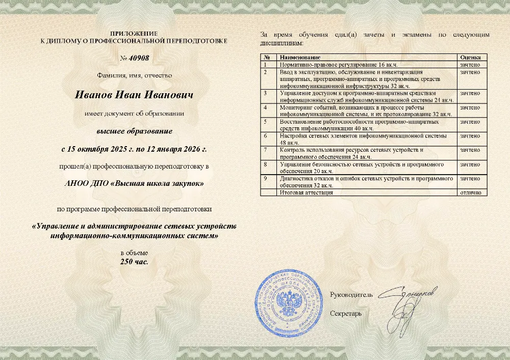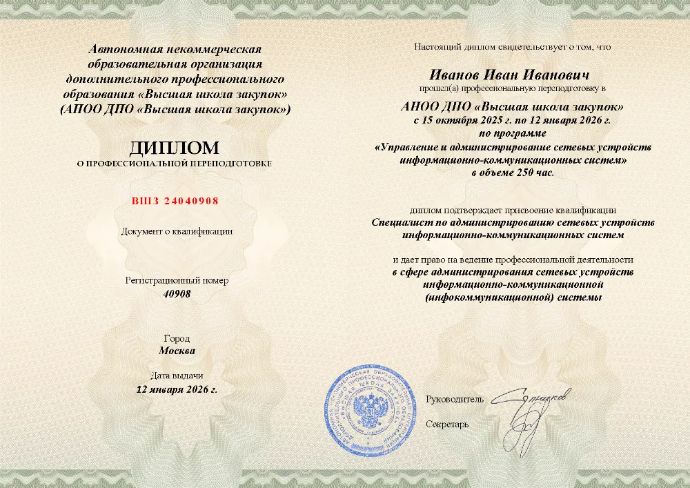 Профессиональная переподготовка, 250 академических часов, 9 модулей: нормативно-правовое регулирование и ввод в эксплуатацию, настройка и мониторинг сетевых устройств, управление доступом и безопасностью, диагностика и восстановление работоспособности инфокоммуникационных систем. Онлайн-обучение в в Воронеже с итоговой аттестацией.