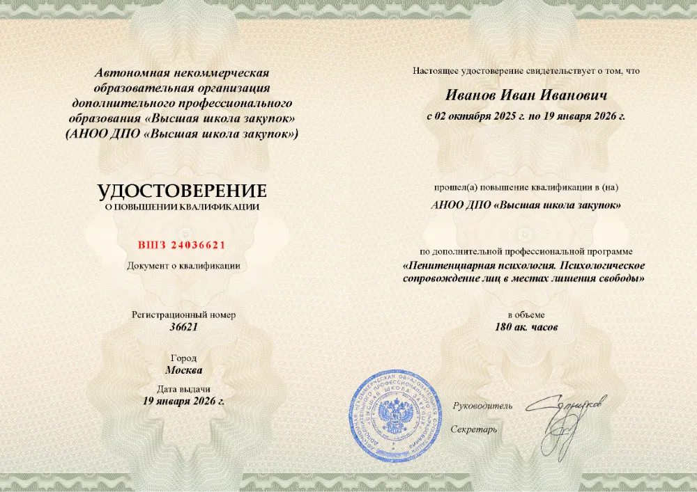 Повышение квалификации, 120 академических часов, 14 модулей: теоретико-методологические основы и нормативное обеспечение, криминальная и виктимологическая психология, судебно-психологическая экспертиза, психология следствия и судебного процесса, работа с осужденными и профилактика правонарушений. Онлайн-обучение в в Воронеже с итоговой аттестацией.