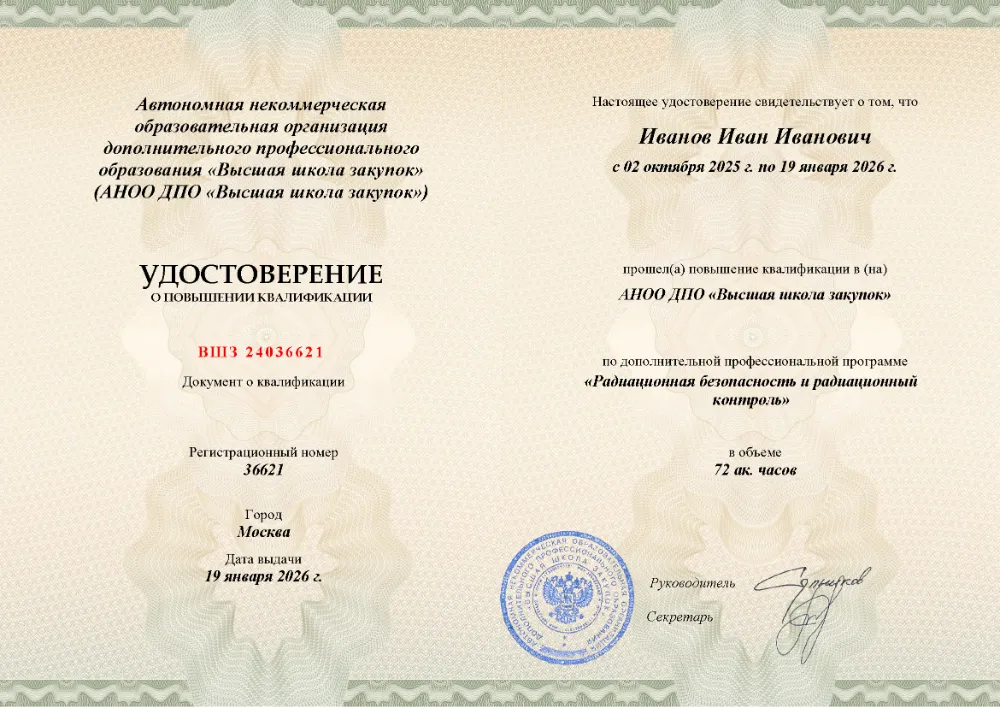 Повышение квалификации, 72 академических часа, 9 модулей: законодательное и нормативное обеспечение, дозиметрия и приборная база, лицензирование, методики радиационной защиты при эксплуатации и обслуживании установок, действия при авариях и ЧС. Онлайн-обучение в в Воронеже с итоговой аттестацией.